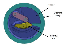 The lowest resistance to opening the hearing aid is by inserting a little wedge between the rotating arm (holding the battery) and the housing. The arm rotates about a pivot point (identified with the CAD model).