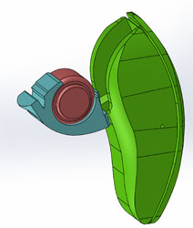 CAD that I produced overnight in order to find the pivot point and get shape of the hearing aid. Left: Solidworks CAD of hearing device. Right: motion of the battery holder showing the location of the pivot point.