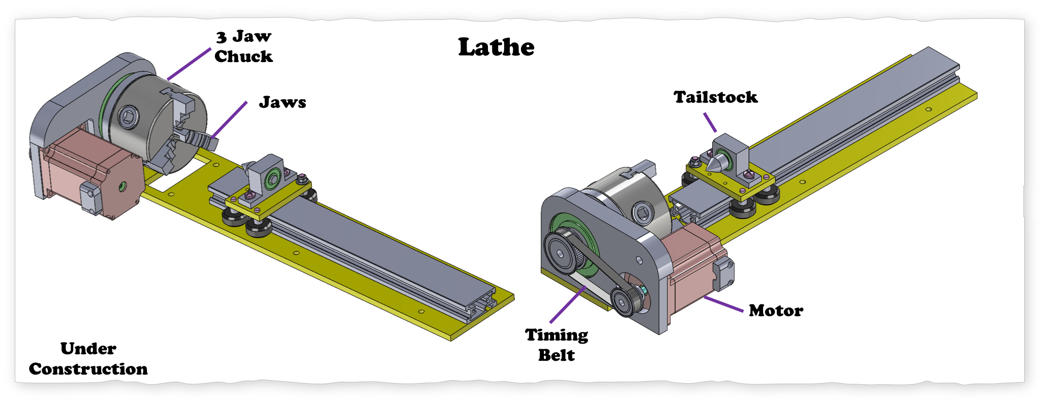 Millie is made up of an array of parts manufactured in at least five ways: 1) Waterjetting: The yellow plates appear to be waterjetted based on the edge surface even after the coating, those features are still visible. 2) Aluminum extrusion: The bed of the router is composed of three extruded plates. The two long channels of the y axis (shown in black) as well as the gantry (shown in black) are also composed of extruded aluminum components. 3) CNC Milling: The forth axis (cnc lathe part) has an aluminum vertical mounting plate that has been CNC milled. 4) Injection molding: The wire guides to minimize wire entanglement are made using injection molding. And 5) Composites: The plates bellow the wire guides are made of a sandwich of materials. Mmmmmmm, like those little ice cream sandwiches.