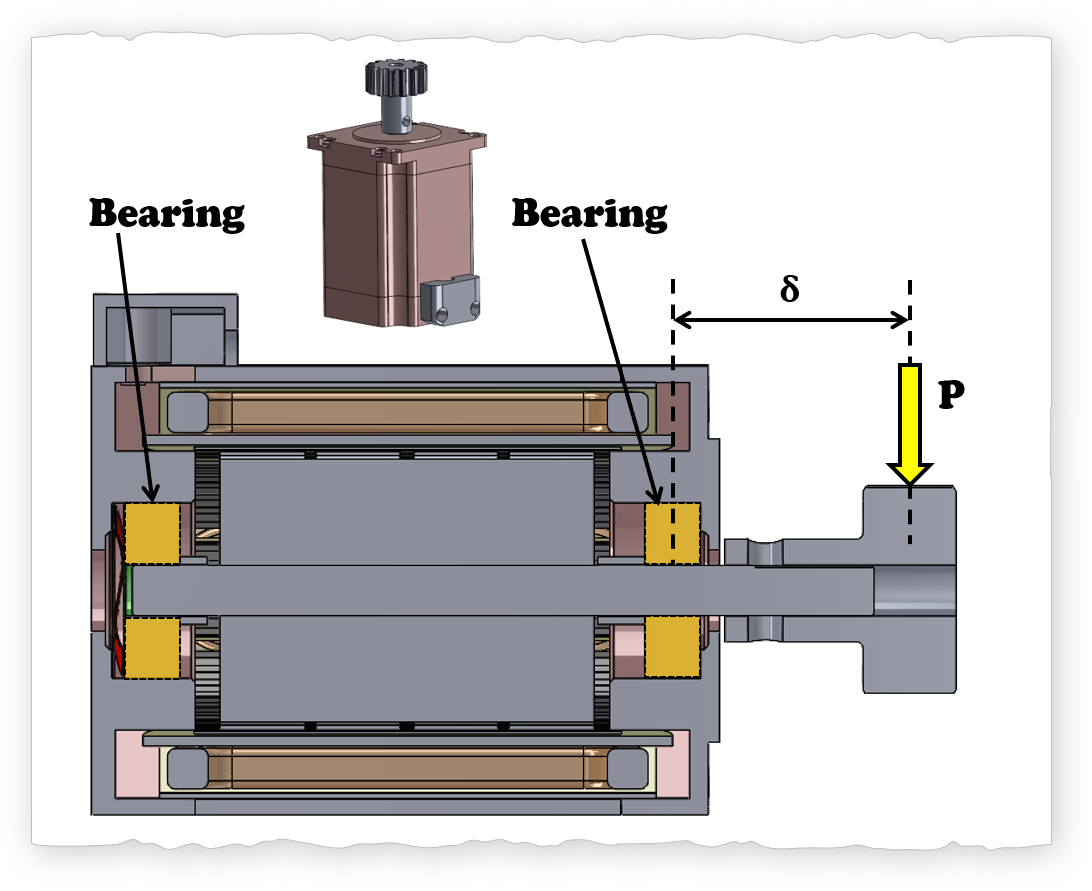 For precision machines, one quick tip is to place the loading as close to the bearing as possible. As \( \delta \) increases the bearing life of the motors decreases. Early in the design stage it is good to keep this tip in mind.